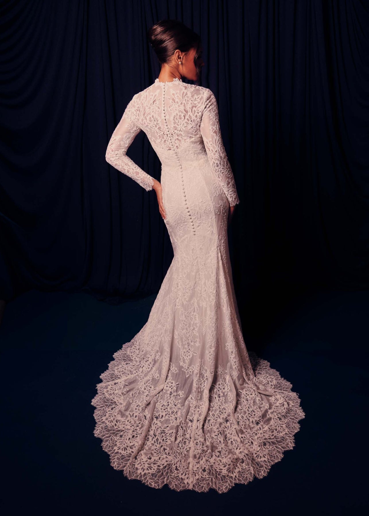 Complete your look with corded embroidered lace in the Holden top. Pair her with the Holden gown to complete the look. This style is a single layer of corded lace for a transparent look. Hand applied lace appliqué finish the neckline, while sleeve hem and waist hem are finished with lace's scallop edge. Elegant center back covered buttons close the style with elastic loops. Buttons also close sleeve vents that can be worn open or closed.