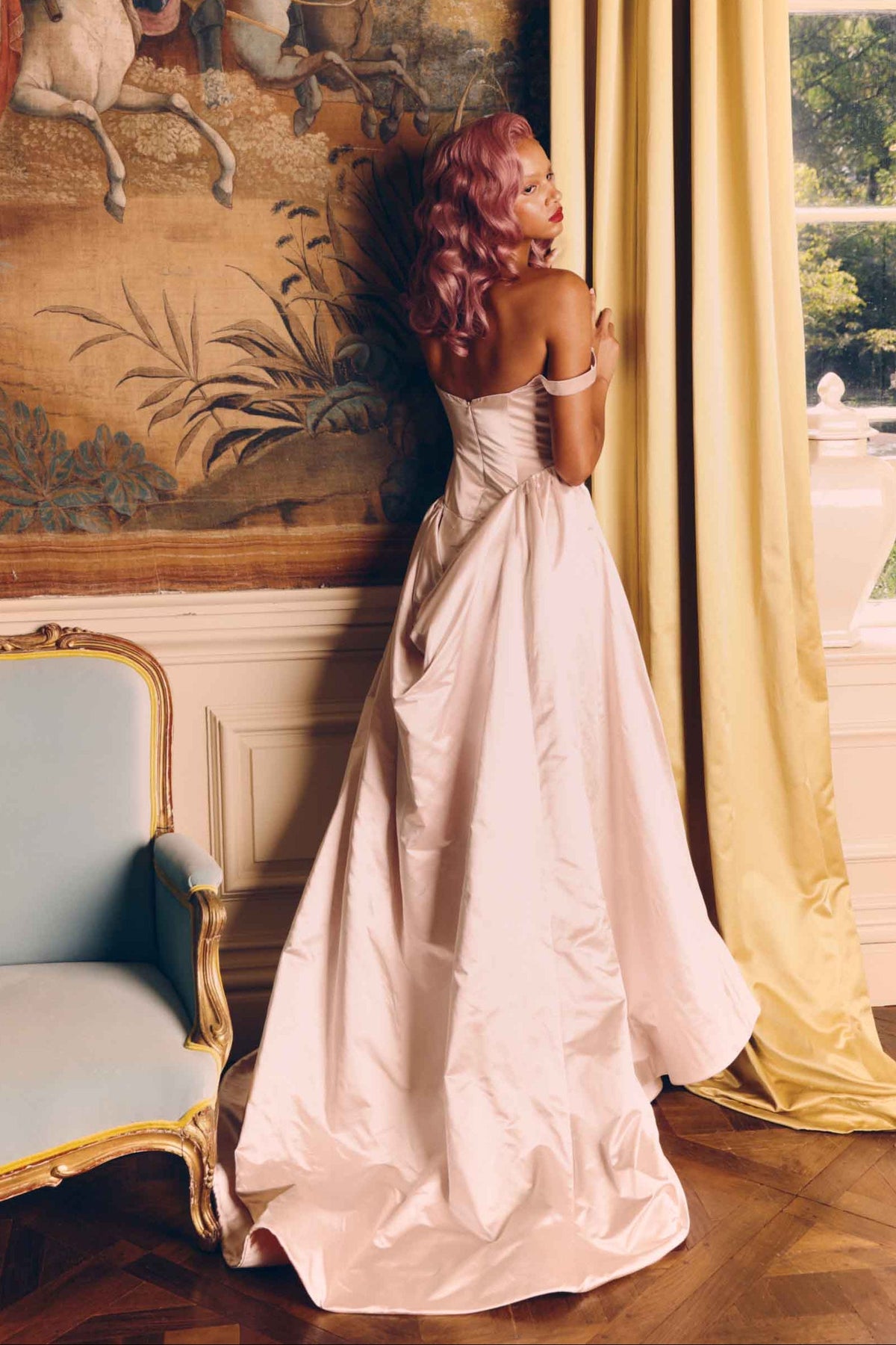 Claudel is a new fabrication of our popular Loren gown, now in shiny Italian Duchesse satin. She is an asymmetrical column gown with heavily boned bodice to give a corseted fit. The bodice brings interest with an asymmetrical draped neckline and straps. An elegant front skirt drape completes the look. It is highly recommended to pair with the removable Claudel Overskirt.