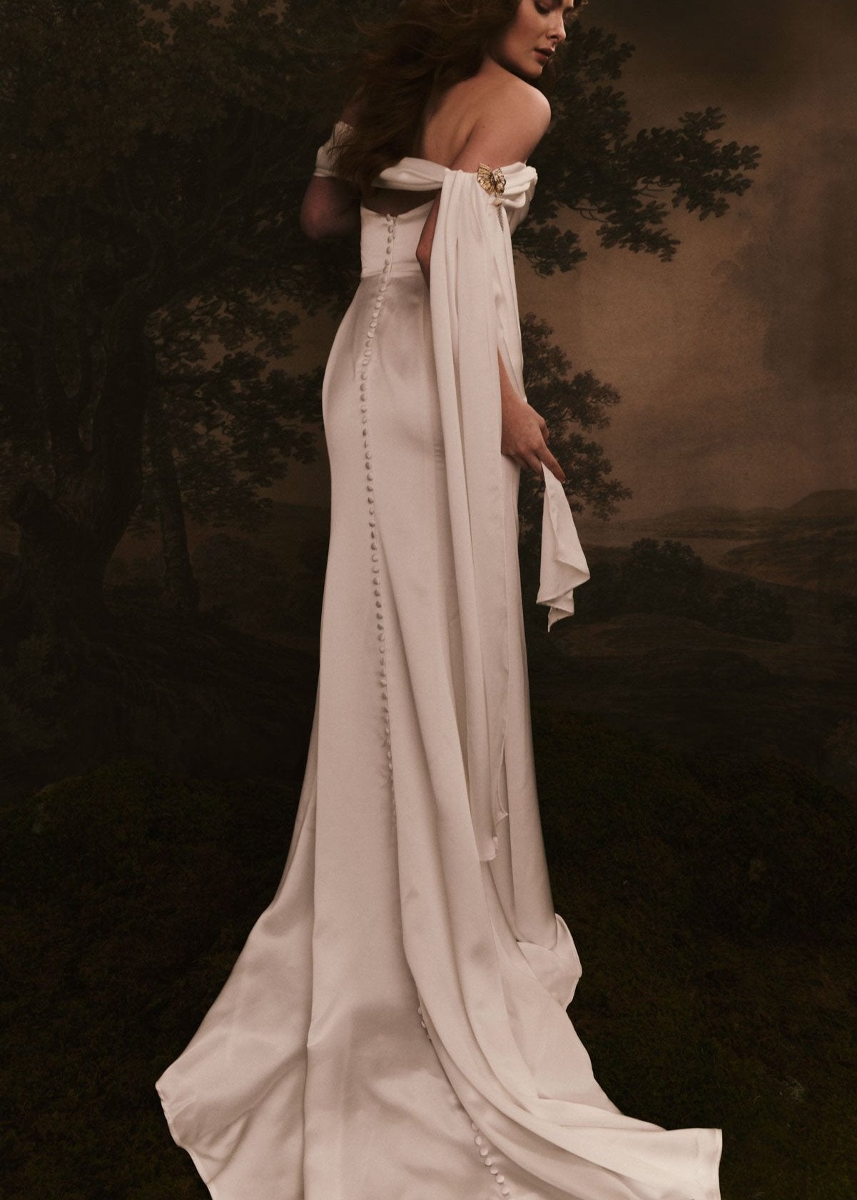 Be romantic. This softly draped gown will give you versatility and romance. A structured bodice holds up a cowl front neck drape and convertible arm sashes that can be tied off the shoulder, on the shoulder, or some combination of the two. The skirt has asymmetrical pleat details at the hip. To finish the look, covered buttons run from the back neckline to the hemline of skirt.