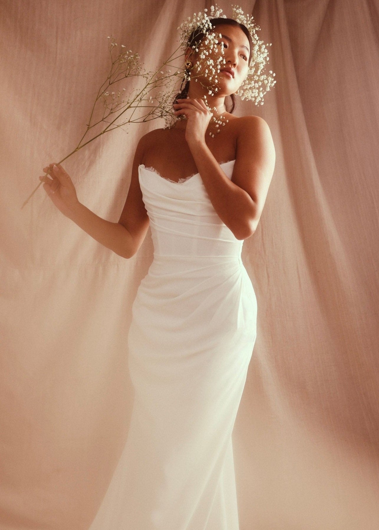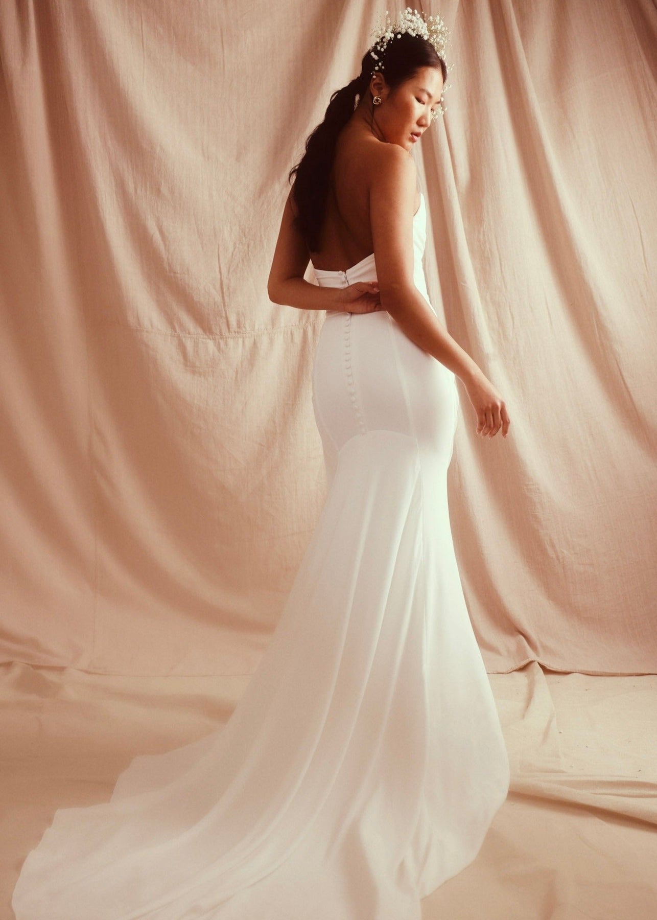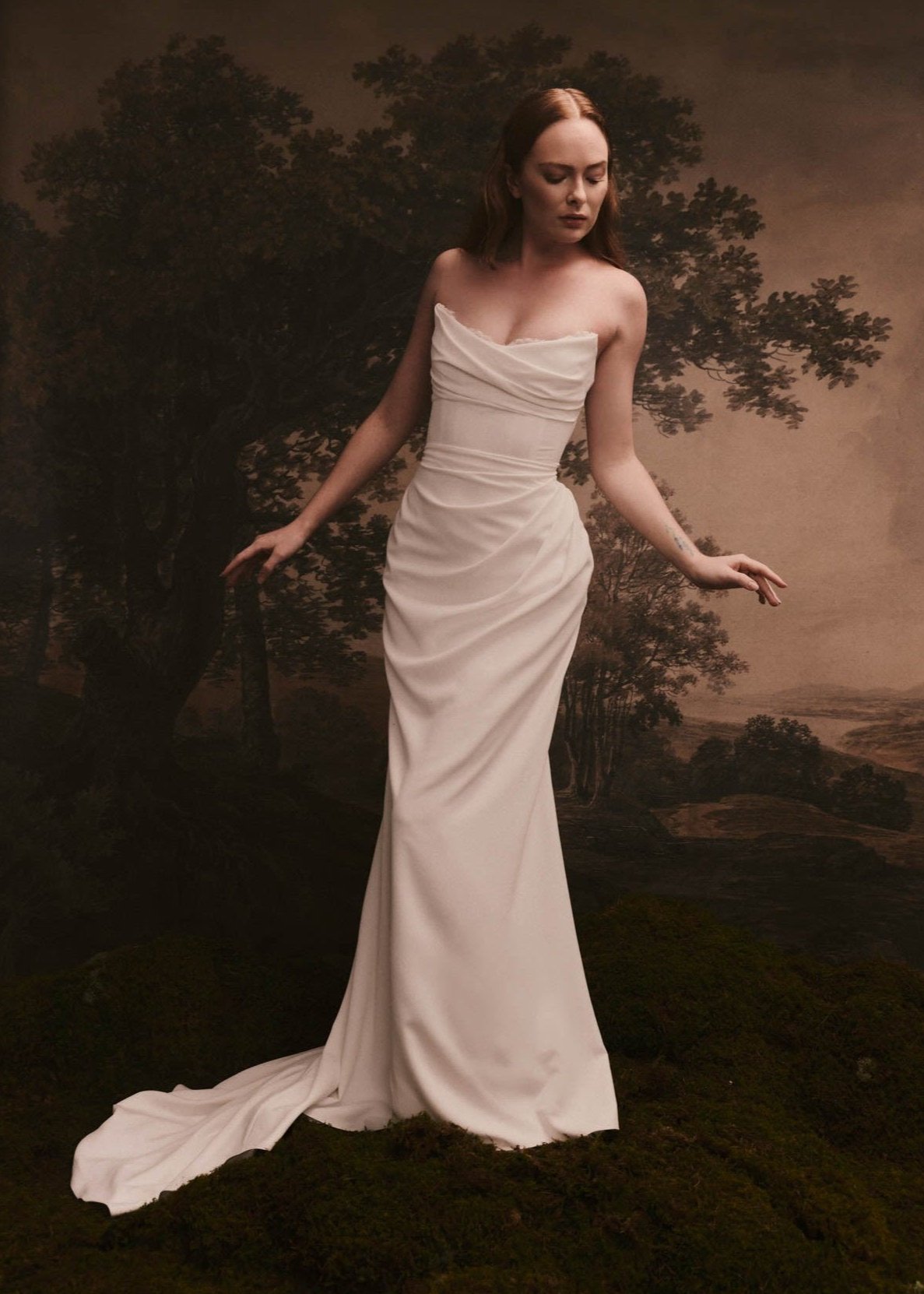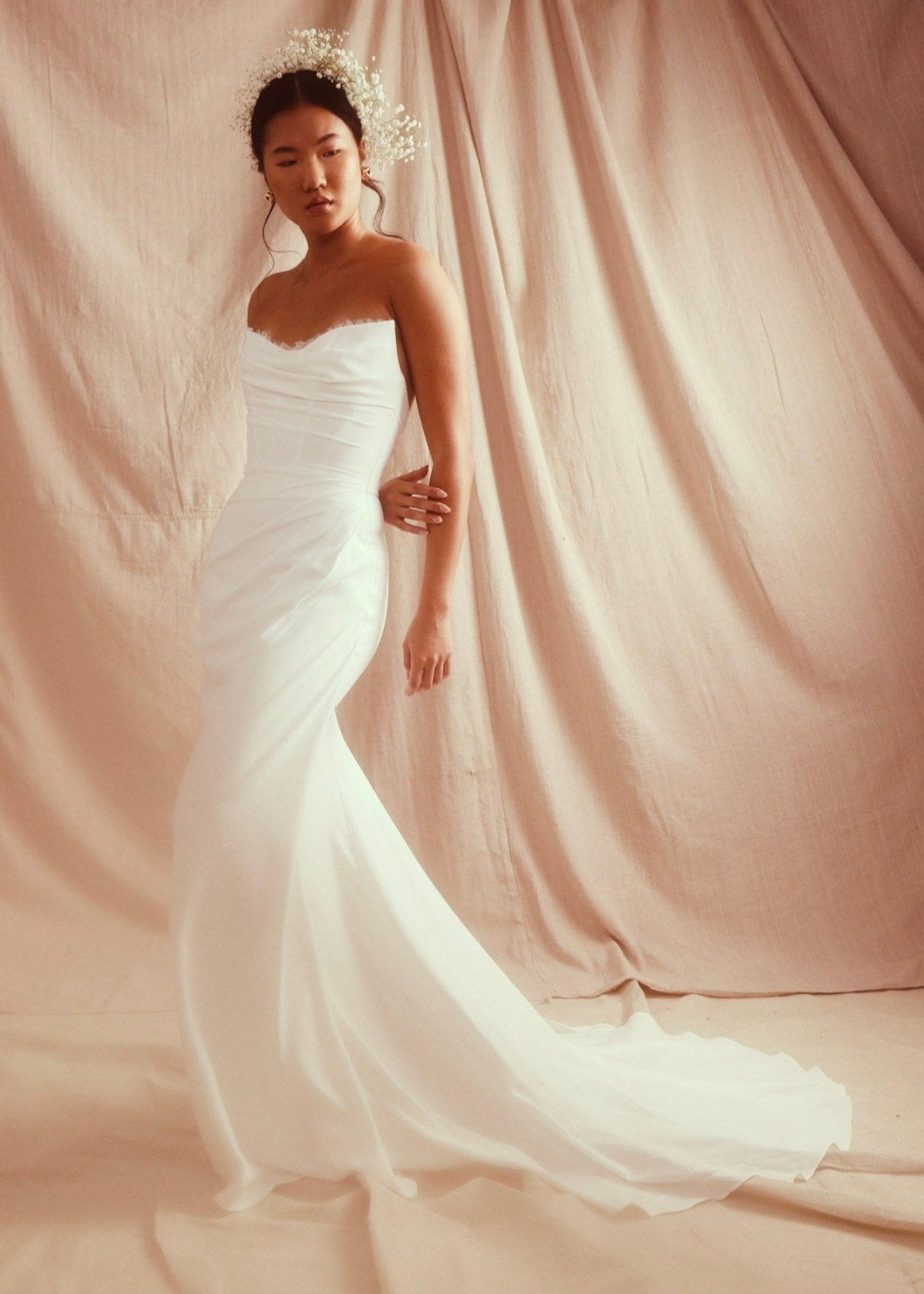 Look like a goddess. The interior corset will give you all the support you need to look effortless in this softly draped double georgette gown with peek-a-boo lace neckline. The Lina skirt is fitted through hips and extends into the perfect train. Covered buttons cover a center back zipper entry and extend onto the upper skirt.