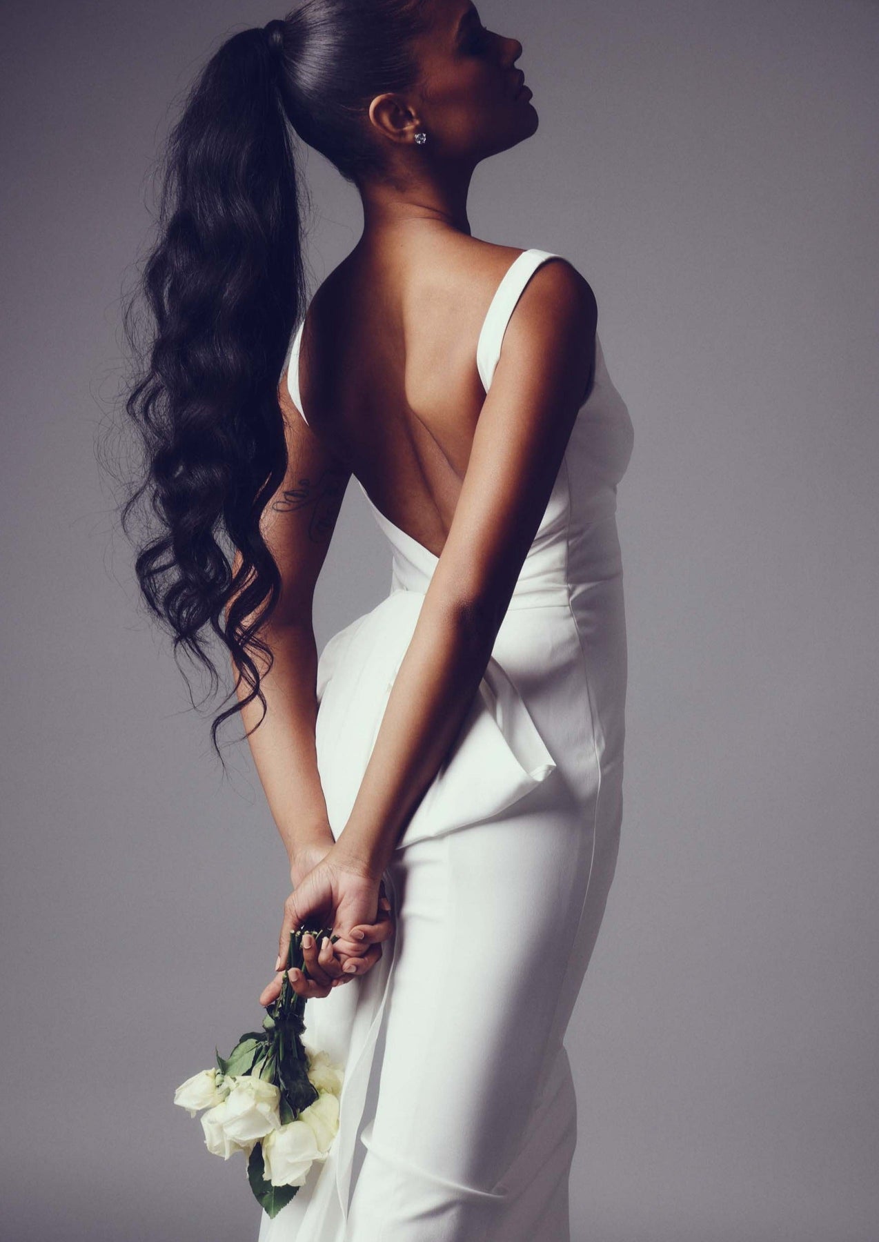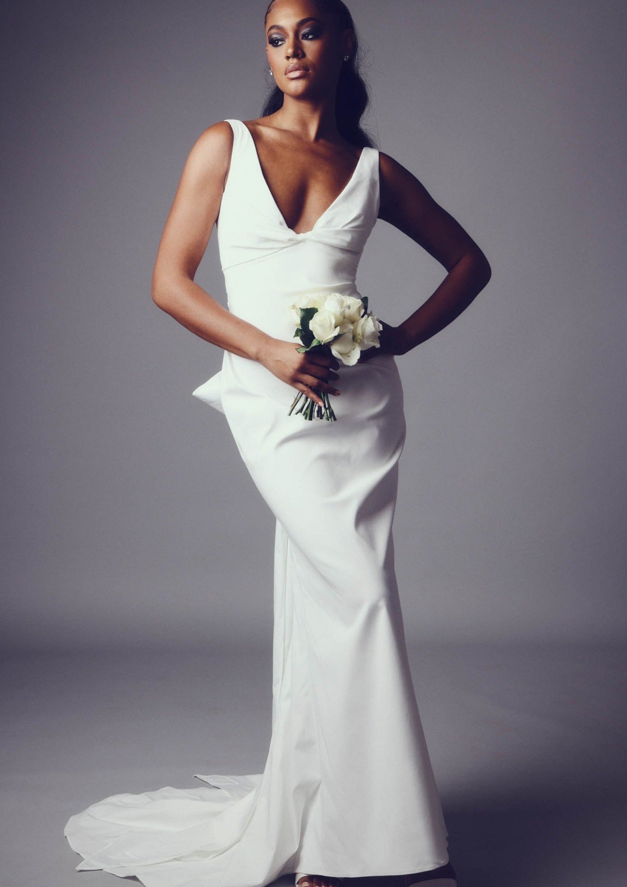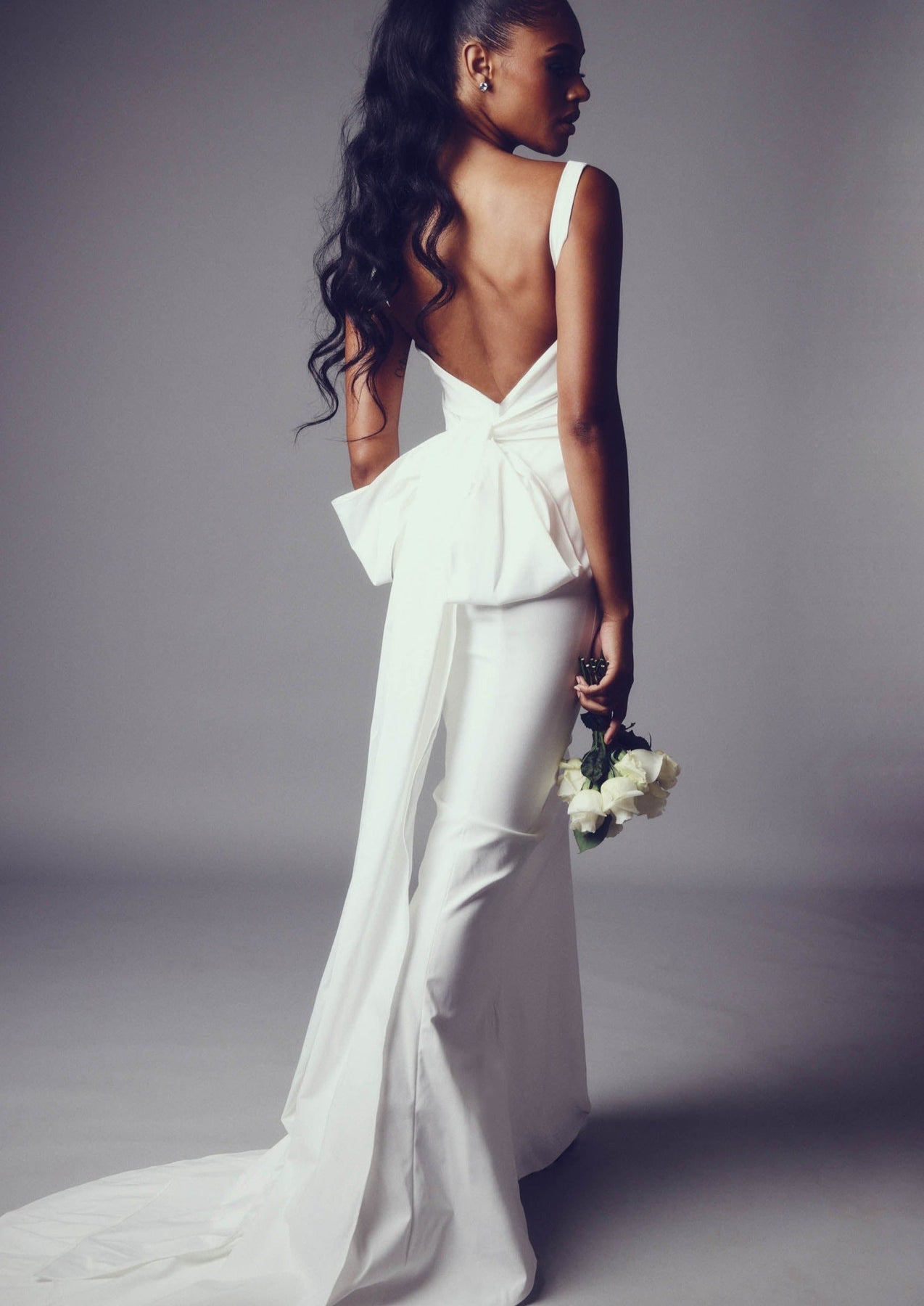 A slim fitting stretch crepe-back satin gown with twisted drape detail at the center front bust to create a low front neckline with shoulder straps. It features a low v-back waistline and ties that extend from the side seam to create an adjustable bow with dramatic bow tails that ties in back and extends to the floor.